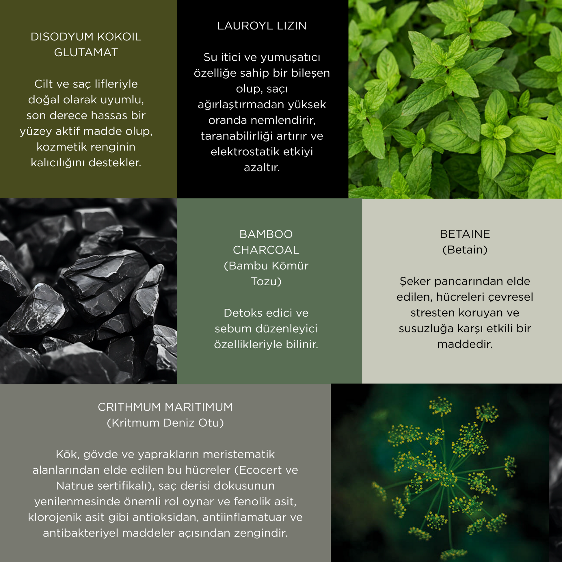 İçindekiler: Su, Shea yağı (Butyrospermum Parkii), Bis-(İzostearoil/Oleoil İzopropil) Dimonyum Metosülfat, Stearil alkol, Behentrimonyum klorür, Aktif kömür tozu, Deniz rezene özü (Crithmum Maritimum ekstresi), Hidroksipropil metilselüloz, Hidroksietilselüloz, Parfüm, İzopropil alkol, Etilheksilgliserin, Fenoksietanol.
