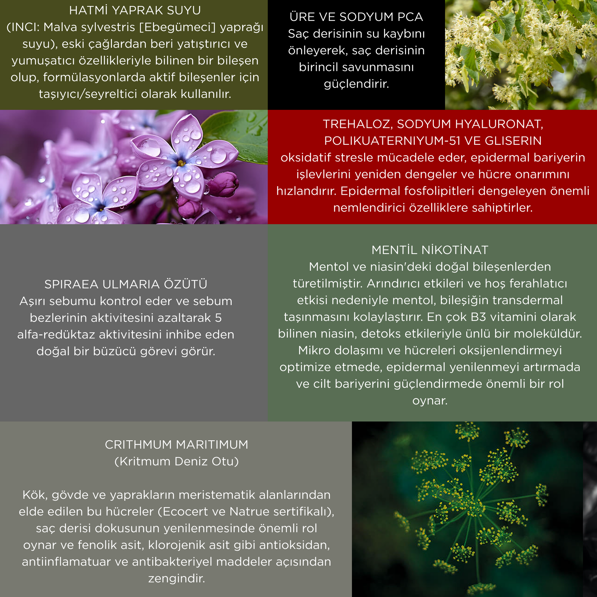 Hatmi özütü, spiraea ekstresi, üre, sodyum PCA ve hiyalüronik asit gibi içeriklerle zenginleştirilmiş bu esans, saç derisinin doğal savunma mekanizmasını destekler, rahatsızlık hissini hafifletmeye yardımcı olur.